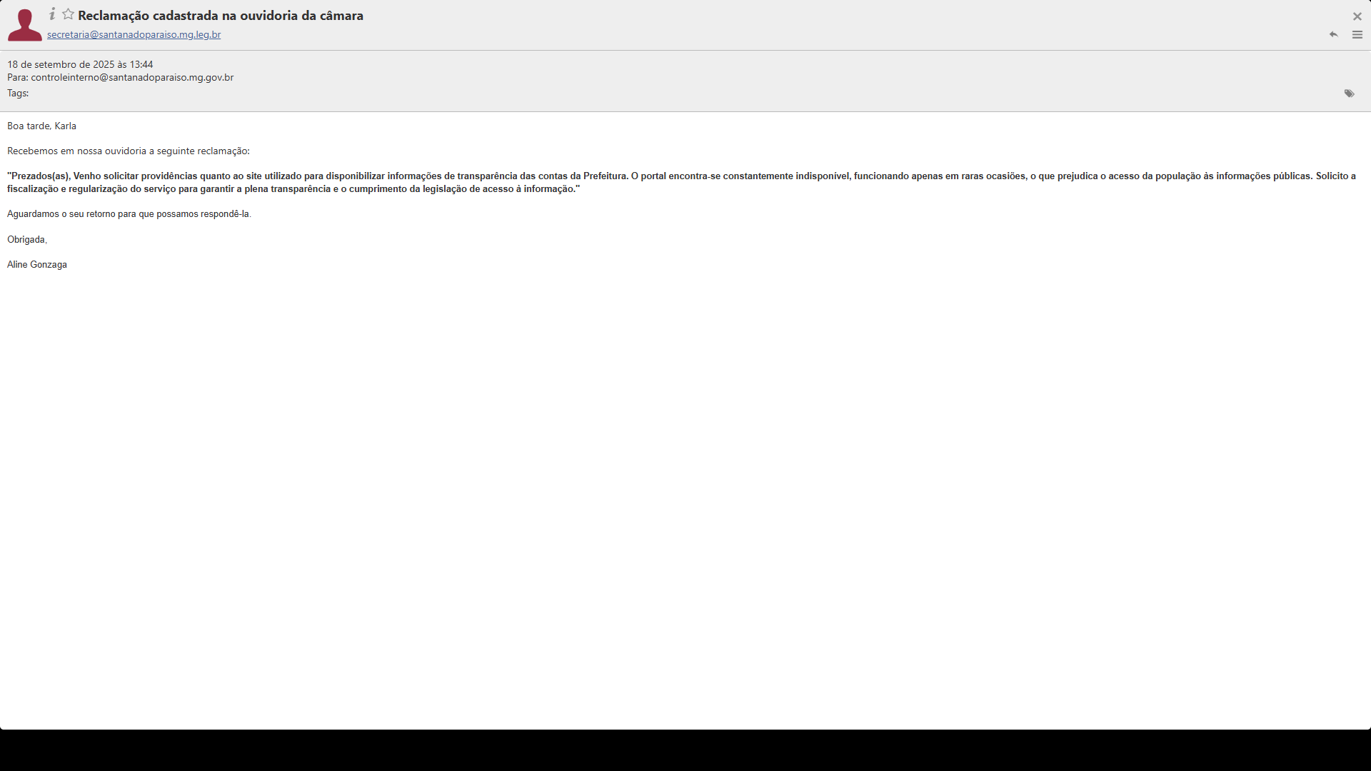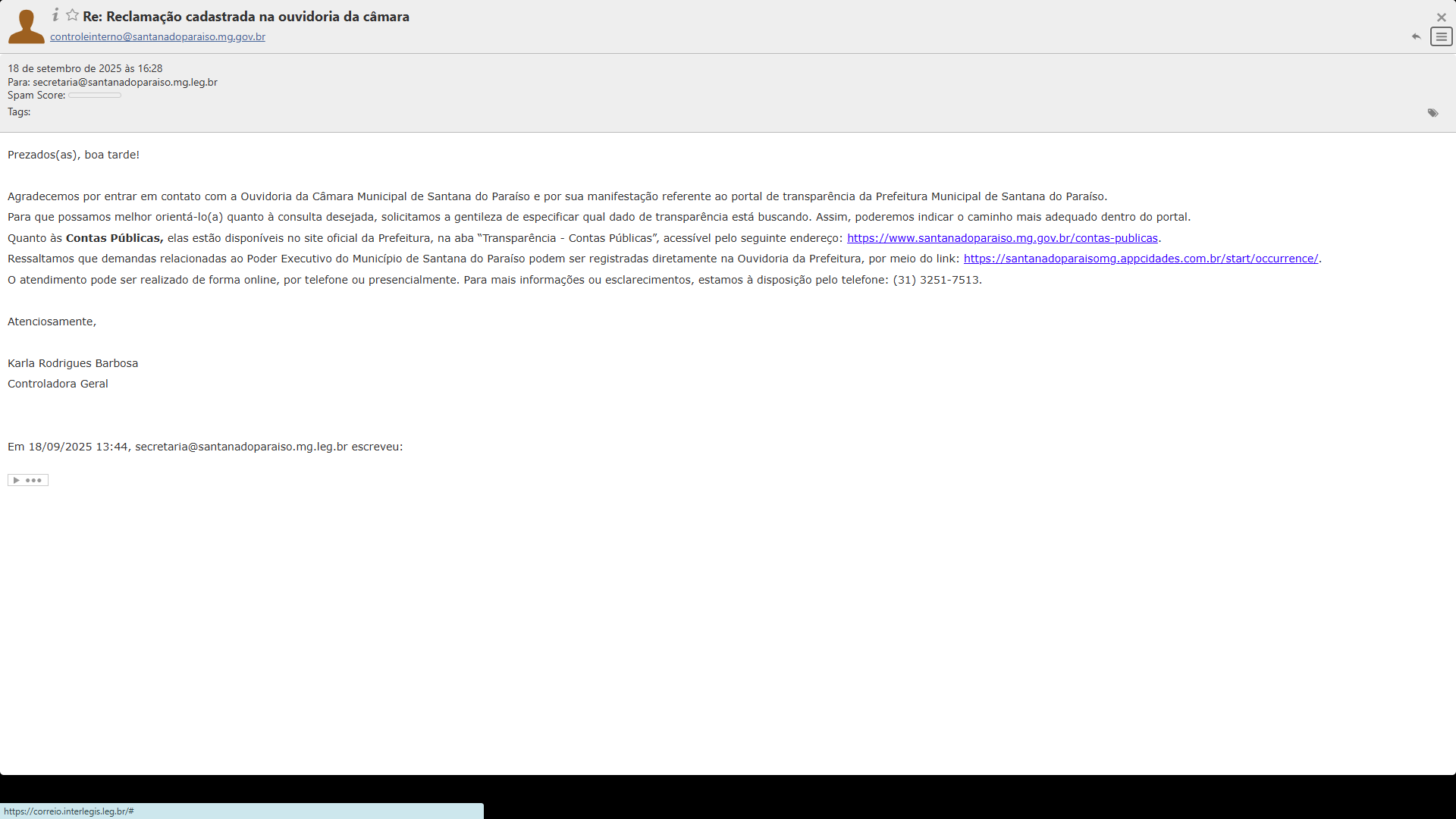 | 01/10/2025 | Solicitação de regularização do site de transparência |