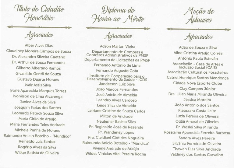 Na noite desta terça-feira, dia 25 de novembro, em clima de muita festa e brilho a Câmara Municipal de Santana do Paraíso, realizou no salão de festa Florenza a solenidade de entrega de Títulos honoríficos e Honrarias, concedidas ás pessoas, associações, empresas ou organizações que tenham prestado relevantes contribuições para o desenvolvimento de Santana do Paraíso. Foram outorgados os títulos de Cidadania Honoraria, Honra ao Mérito e Moção de Aplausos. As indicações feitas pelos vereadores passaram pela aprovação do plenário da Câmara Municipal.